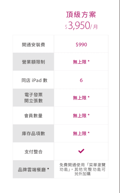 1.可連接使用 iPad 數 6 台 2.電子發票開立張數無上限 3.會員數量無上限 4.庫存品項數無上限 5.支付整合功能 6.品牌雲端餐廳 *備註1 - 備註: 1. 雲端餐廳可免費使用瀏覽菜單功能,其他完整功能需另購雲端餐廳功能模組,收費方式請參考 iCHEF 官網。 2. 「無上限」數量為 iCHEF 系統最高規格,該限制以 iCHEF 公告為主。