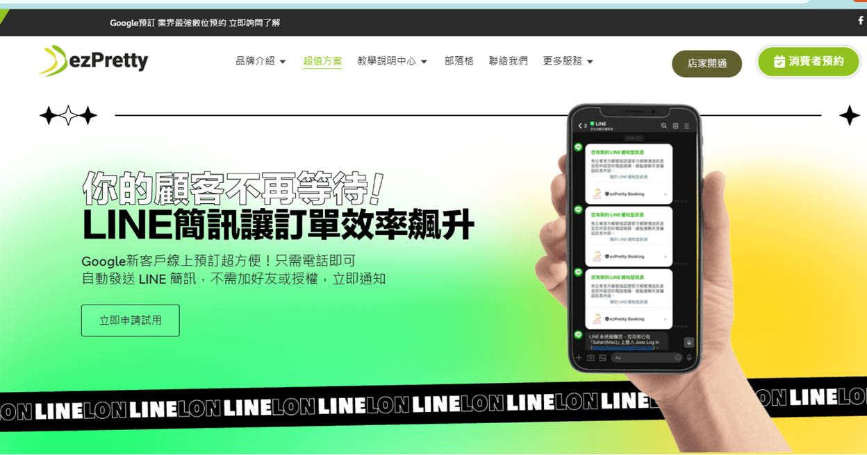 1. 使用Google搜訊線上立即於預約訂 提升店家新客導入。 2. 提供專屬認證Line簡訊 (LON)。 高開啟率:由於 Line 在台灣是高頻率使用的通訊軟體,推播消息通常具有較高的開啟率,遠高於傳統的電子郵件或 SMS,通過 Line簡訊機制,只須知道消費者的電話, 企業就可以立即向預訂消費者發送Line推播,確保信息在短時間內到達用戶手中。 3. 增粉: 新客戶快速加入店家會員。 3. 降地消費者預約複雜度,提升忠誠度, 提升店家工作效率。 4. 提供線上支付讓預約減少未出現。 5. 透過全通路 (Google, Line) 都可以整合 line簡訊 。