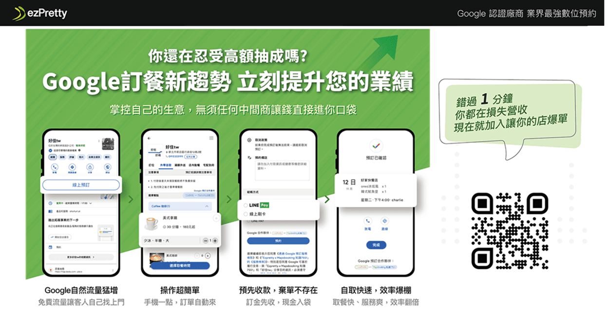 1. 店家先建立自己的google 我的商家 2. 透過 ezPretty 的店家後台建置. 開啟 Google 線上預訂 3. 根據 不同產業 給予不同的 預約方式. 例如 飲料店 就可以 外帶 買額外送等 例如 沙龍 可以提供 設計師的服務 和 日期的預訂 進階可以先完成線上支付 才完成 預訂. 避免no show 問題.