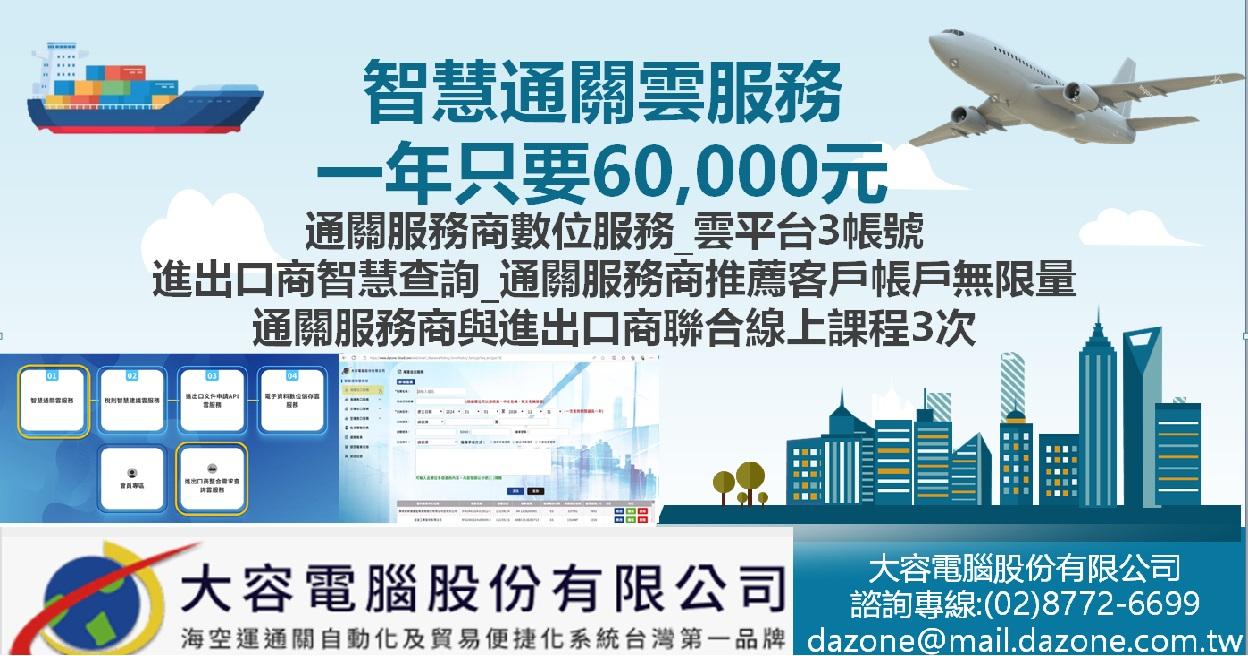 1. 報關行繳納智慧通關雲服務年費,取得3個帳號,可多工分責,服務客戶。 2. 報關行應用智慧通關雲服務,處理進口與出口報關業務。 3. 進出口商客戶,應用免費進出口商整合需求查詢雲服務,掌握通關進度。 4. 提供報關行3次線上課程,由報關行邀請進出口商客戶,線上由大容電腦講師,帶領操作智慧通關雲 服務。