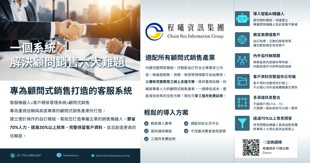 本系統以3 大模組為核心,保持客戶使用LINE、FB 習慣,整合企業流程, 促成轉型。並整合醫療產業需求, 提供線上互動諮詢、以整合內外協作改善人力負擔。 (1)信賴經營模組:整合多渠道進線(如:FB、IG、LINE)可於本系統上一站式應答,以增強內外協作為核心,幫助業務減負、改善人力、提高客戶信心 (2)經銷商管理模組:分析客戶端進線紀錄、資料彙整及歸檔,有效幫助未來進行調閱及分眾行銷 (3)輔助機器人模組,導入智能AI 機器人,並擬定可自訂之基本模板,開放由各使用者自由編輯問答內容,可於客戶洽詢時先行過濾基本問答、亦可於專人洽詢過程偕同使用。