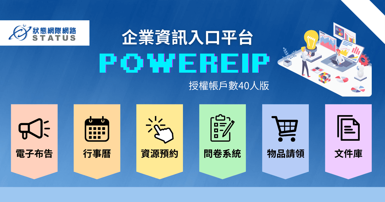 資源預約、EIP系統、行事曆、企業資訊入口平台、電子布告、文件庫、問卷系統、物品請領、PowerEIP、EIP、會議室預約