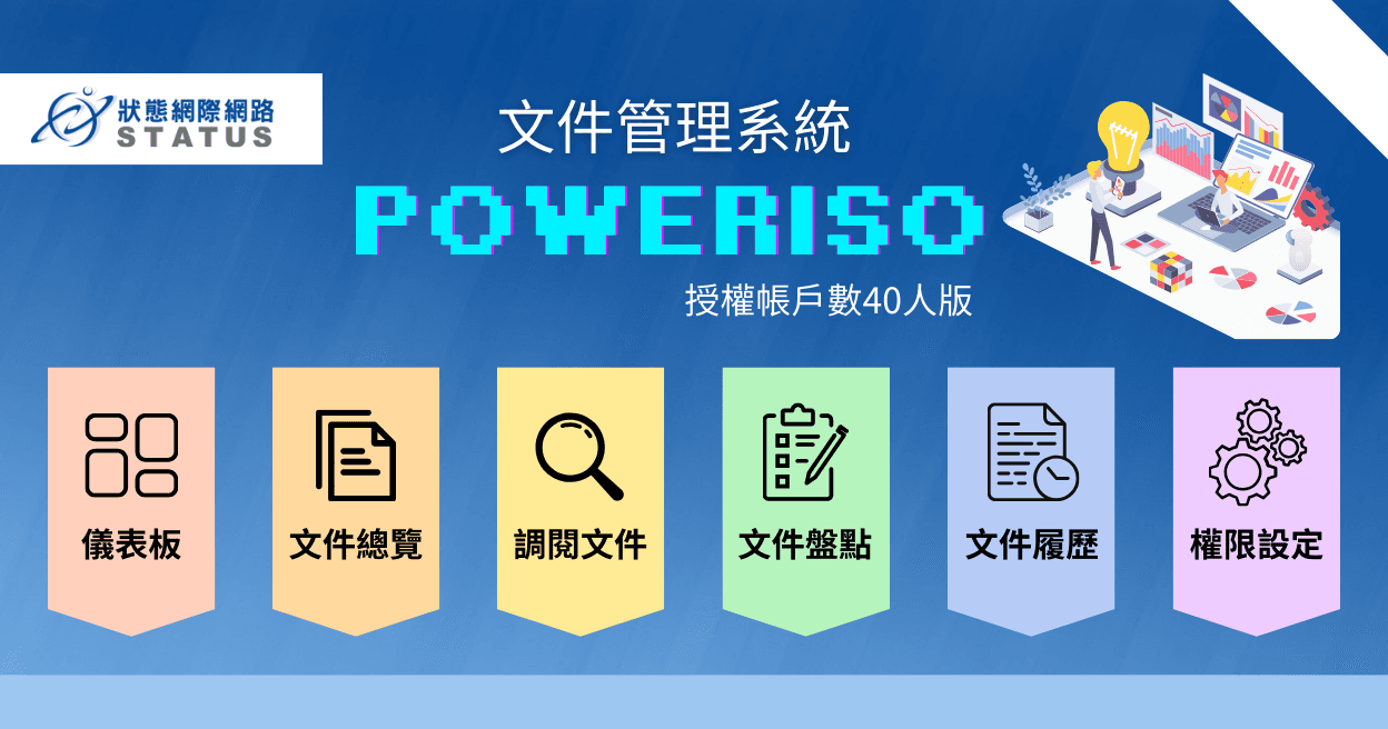本系統專為中小企業設計,針對常見痛點提供解決方案: 1.紙本文件電子化,減少文件損毀與存放空間。 2.系統介面操作直覺化,不怕同仁不會使用與沒有資訊人員也可輕鬆導入。 3.支援RWD設計,使用任何裝置沒煩惱。 4.完整記錄任何操作歷程確保資料安全性。 5.隨處皆可調閱文件,不怕沒進公司就無法調閱。 6.文件盤點清單快速製作,準備稽核文件不慌亂。
