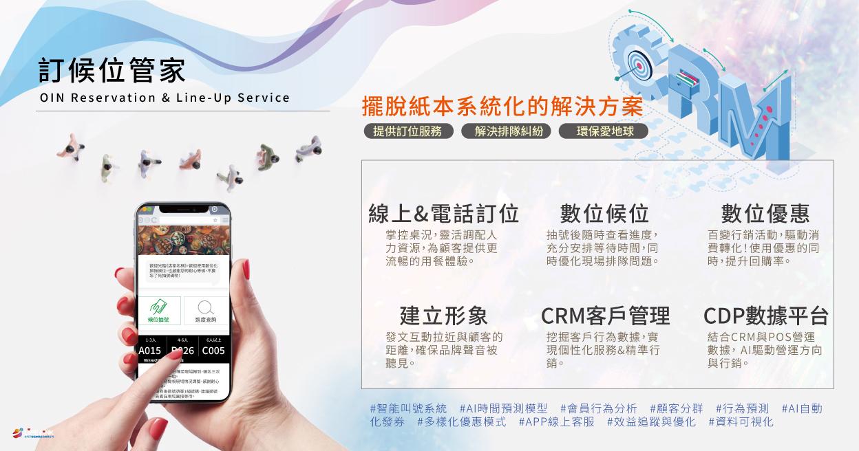 候位:有效解決排隊店家的需求,排除抽號插隊糾紛,避免消費者在現場苦等,提高消費者用餐滿意度。 訂位:不限時間地點,直接操作訂位,省下電話接聽人力,線上化消費者可自行操作訂位、修改時間或取消,皆無須店家服務。