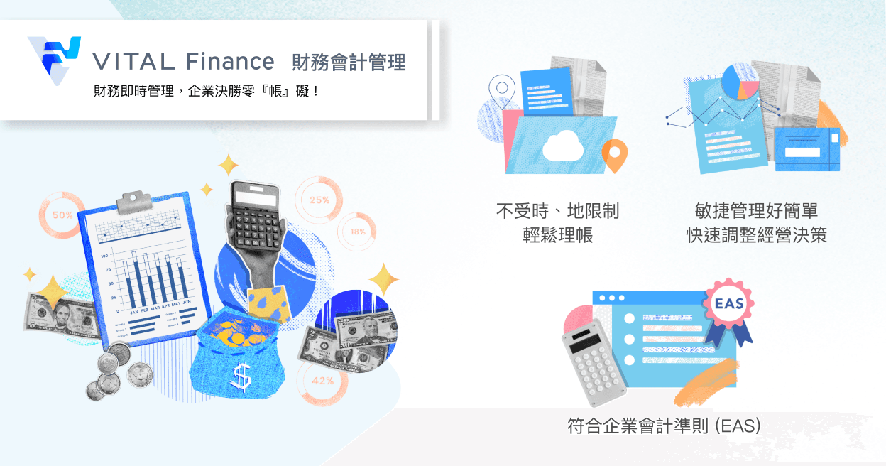 Vital Finance 財務管理適用於中小微型、企業及新創企業使用的會計總帳、應收應付與財產管理系統。提供中、英、日語系服務介面及報表,簡單易上手,高度彈性可自訂啟用多幣別、部門、專案等,使用者可適自身需求,無需工程師就能自行設定,是一個容易轉換、輕鬆上手的財務系統。