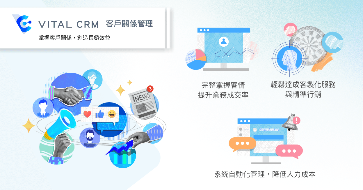 Vital CRM 適合經營公司客戶的B2B業務團隊,解決客戶資料散落,業績預測失準的問題,以及面對B2C消費者需要經營會員精準行銷的品牌,廣告預算愈來愈高,無法累積第一方客戶數據的企業。 具備彈性、多元的客戶欄位設定,支援快速貼上標籤,快速找出目標客戶,設定待辦工作,不遺漏任何關於客戶的交辦,利用聯繫腳本,自動化關懷客戶不間斷,搭配Insight 分析模組,彈指完成可視化分析,社群媒體整合模組,無縫整合LINE官方帳號及FB Messenger讓客戶服務互動更全方位,自動化中心模組,協助處理繁瑣的日常作業流程。