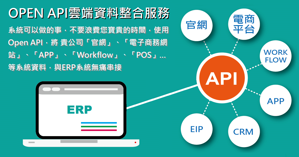 建置「官網」、「電子商務網站」,正在使用「APP」、「Workflow」、「POS」…等系統的中小微型企業,這些系統的資料如何與ERP串接?快速開立電子發票? 中小微型企業普遍人手不足,系統可以做的事,不要浪費寶貴的人力,使用Open API,以下資料情境將由系統自動完成 網站會員資料寫入客戶資料 網站、APP查詢客戶交易歷史、客戶信用額度 網站、APP查詢產品現在庫存量、交易單價 網站訂單自動產生銷貨單、電子發票 自動化的異質系統整合,除了免除中小微型企業繁複的資料重複輸入外,更避免人為疏忽產生的錯誤與節省不必要的人工稽核時間,完全符合市場需求、解決企業多系統整合不易的痛點。