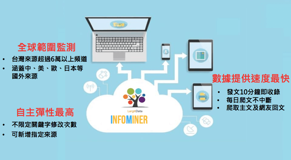 透過輿情大數據分析平台InfoMiner,快速、精準地分析網路輿情,每10分鐘會擷取最新相關國內外新聞及社群資訊共包含6萬個頻道源以上,並立即精準分析相關數據提供給使用者. 1.產品數據收集-快速了解自身產品及競品在網路上的評價與網友的回饋 2. 公關危機應用-快速統整分析危機事件的源頭及網路與論方向,以能快速掌握處理方式 3. 行銷數據收集-了解當下熱門話題,以結合自身產品文案 4. 產業新聞收集- 快速收集國內外相關產業領域資訊