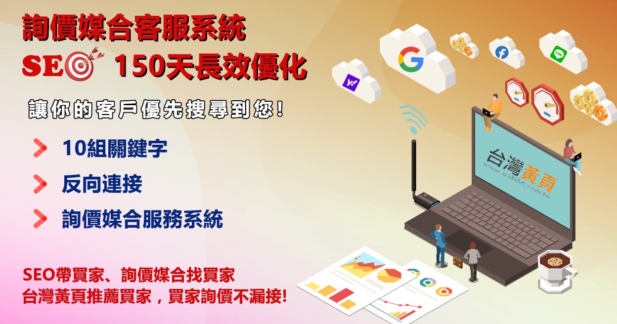 台灣黃頁以行銷官網/產業別/地理區,為您帶訂單、找訂單,讓客戶直接做到生意;專業打造的〝詢價媒合客服系統〞。 廠商設定、更新產業+關鍵字及其產品介紹,服務類別,成為〝詢價企業〞夥伴; 24小時為您守候,將您推薦給買家或物色適當詢價單,相當於請一個虛擬業務助理,幫您篩選精準買家,節省人事成本,且所有詢價單都可以報價,讓網路商機不漏接; 行銷官網+優質外站反向連結,SEO長效穩定,熱門曝光8~10組關鍵字同時優化在Google、黃頁搜尋,排序優化累計可達150天長期效果,簽約後字組仍可依現況調整。