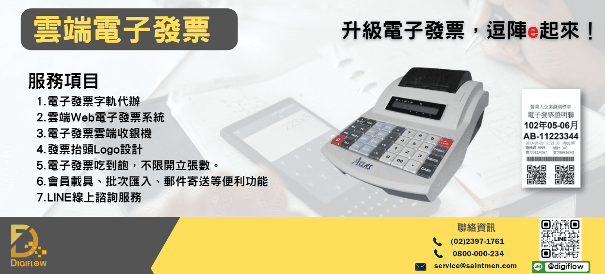 1.電子發票字軌代辦 2.雲端WEB電子發票系統 3.電子發票收銀機傳輸與設定 4.電子發票字軌自動取號配號 5.會員載具、批次匯入、郵件寄送功能 6.服務方案教育訓練