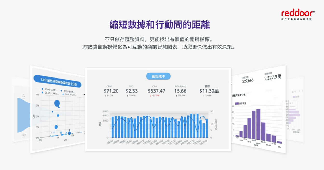 1.跨媒體數據管理平台 2.整合各媒體數據資料 3.自動化產出商業智慧圖表 4.加速梳理各項廣告數據資料 5.轉化與分析廣告數據及應用