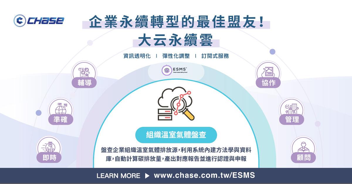 CHASE 結合數位化系統平台與永續管理顧問,將智慧與永續的DNA融入企業經營,協助企業定義重大永續議題,盤點ESG各項數據,針對主要衝擊點規劃策略途徑,導入零碳、零廢等永續方法學,為企業提供一站式智慧永續解決方案。