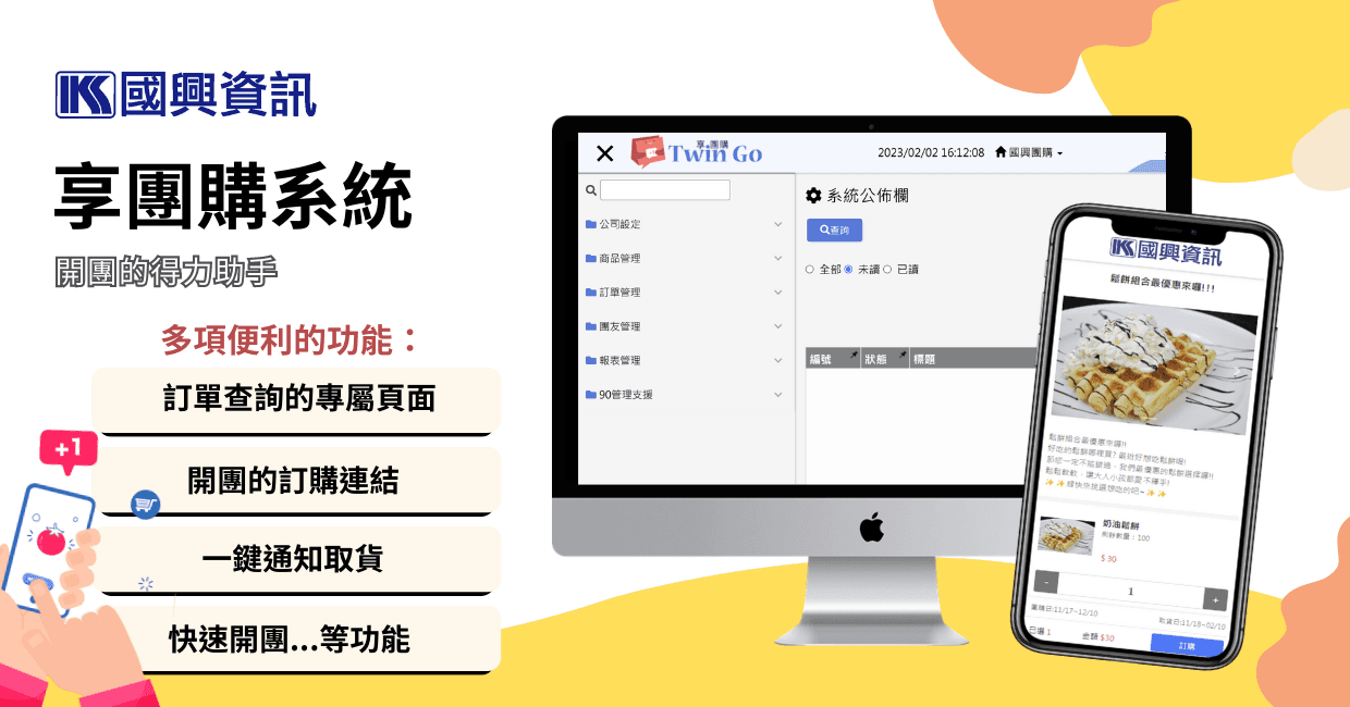 專為LINE群組團購主設計,量身打造的訂單整合系統 享團購無須下載安裝程式,直接透過網頁即可運作,並藉由簡潔的操作介面、效率化的銷售規劃功能、以及強大的團友管理系統和銷售排行分析報表,並同時配合開團組合管理功能,進行一鍵群發商品訂購與訂單查詢訊息至各群組。