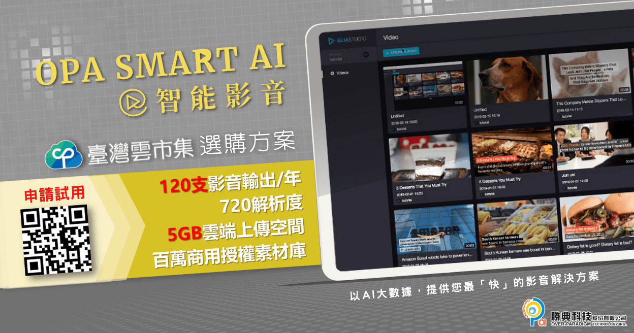 數位轉型時代,影音內容正流行。但傳統的影片製成耗時費力,可能為了取得可商用素材所苦!別擔心,OPA SMART AI智能影音平台提供簡單易上手的影片編輯神器,具備百萬可商用影音素材庫、支援中/英/日/韓/越五國語系,還結合AI大數據科技提供文章自動配對影音媒材、AI語音自動生成、多款影片版型與轉場效果,更可同時產製多支影片,特別適用資源有限的且正在尋求數位轉型契機的企業。OPA SMART AI智能影音將助力中小微型企業成功數位轉型。★掃描圖片QRcode,申請免費試用資格。