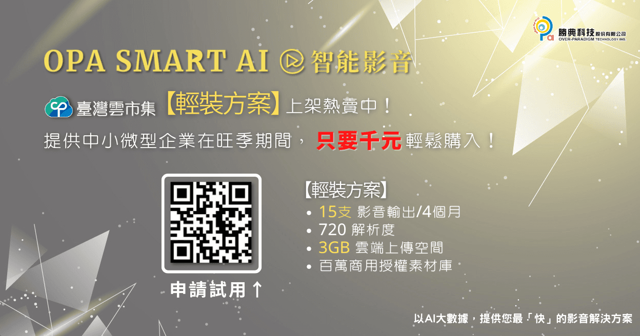 數位轉型時代,影音內容正流行。但傳統的影片製成耗時費力,可能為了取得可商用素材所苦!別擔心,OPA SMART AI智能影音平台提供簡單易上手的影片編輯神器,具備百萬可商用影音素材庫、支援中/英/日/韓/越五國語系,還結合AI大數據科技提供文章自動配對影音媒材、AI語音自動生成、多款影片版型與轉場效果,更可同時產製多支影片,特別適用資源有限的且正在尋求數位轉型契機的企業。OPA SMART AI智能影音將助力中小微型企業成功數位轉型。★掃描圖片QRcode,申請免費試用資格。