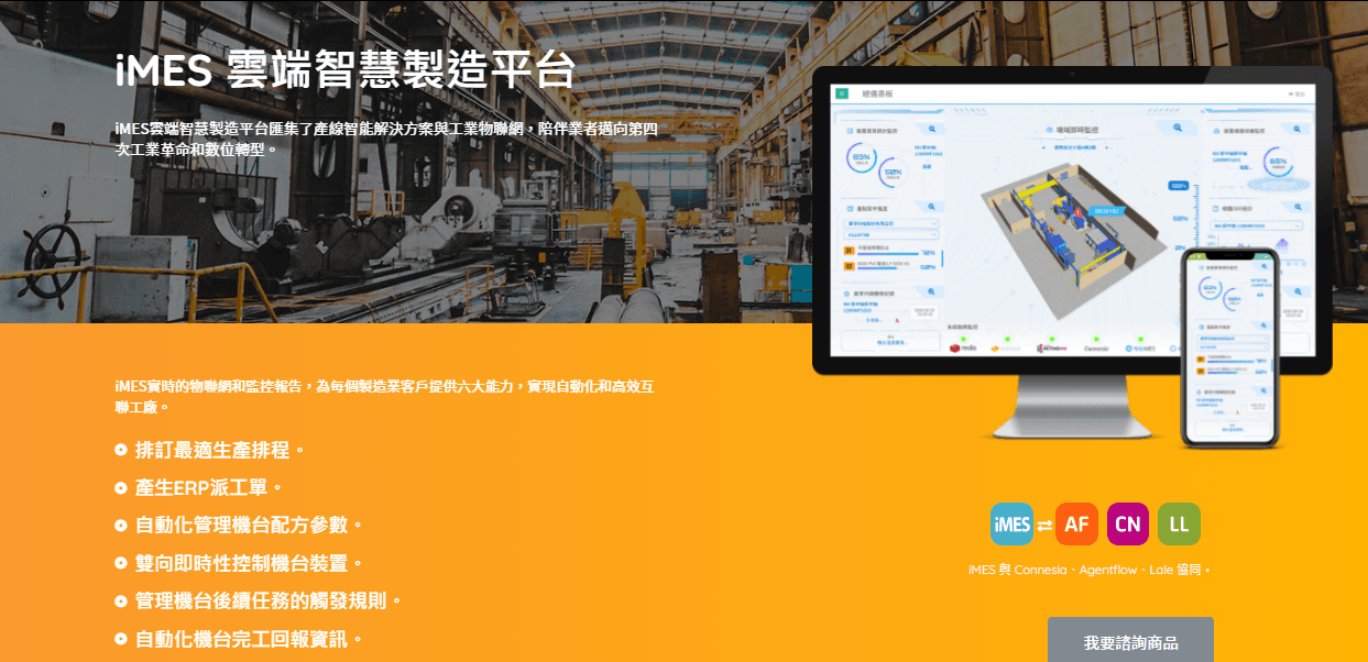 台灣產業比例與特性以製造業居多,加上近年在工業物聯網及跨系統數據運營的趨勢以及企業提倡成本精實、資源用運最大化等目標,製造業紛紛開始追求即時生產資訊及生產流程SOP化,但傳統MES系統普遍有數據獲取不完整、裝置間通訊協定不一致、單機架構的侷限、各系統互不相通等問題,造成生產產線狀況模糊,無法預知風險,導致管理層無法做即時應變與決策,影響生產品質與銷售訂單。 華苓iMES雲端智慧製造平台以SaaS化架構,可以適用在企業內如果有不同的據點生產時,管理者可以透過系統查看到生產的狀態和資料,並可整合ERP等異質系統,進行稼動統計、數據分析等管理儀表板隨手可得,掌握產線現況,降低管理成本,強健工時管理。
