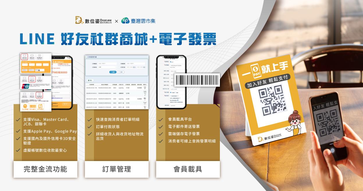數位鎏「LINE 好友社群商城」,可以在LINE官方帳號內建構微商城購物車,透過網路金流提供線上刷卡服務,可提升無現金交易、縮短流程、節省郵費用,並且可降低現金整理、保管、核對作業,並有助於減少人工錯誤。結合好友社群商城,可提供消費者及商家雙方營銷、交易、售後的一站式服務,消費者交易後可直接將電子發票存入會員載具。
