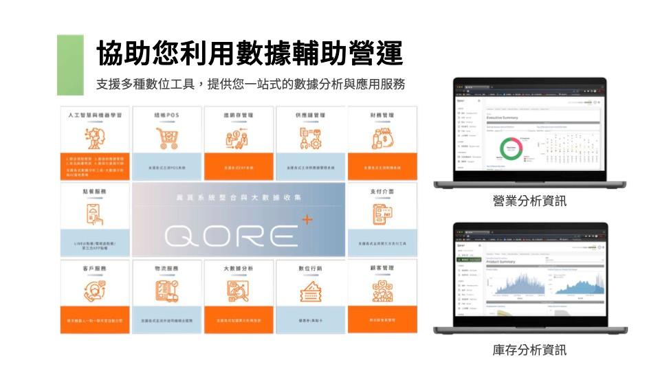 Qore+智慧加盟管理平台,整合客戶需要之系統,後台數據分析提供企業及時營運狀況並以社群對話方式呈現 線上點餐服務/1套 數據收集預測分析/1套 餐飲營運管理平台/1套 客戶關係管理/1套